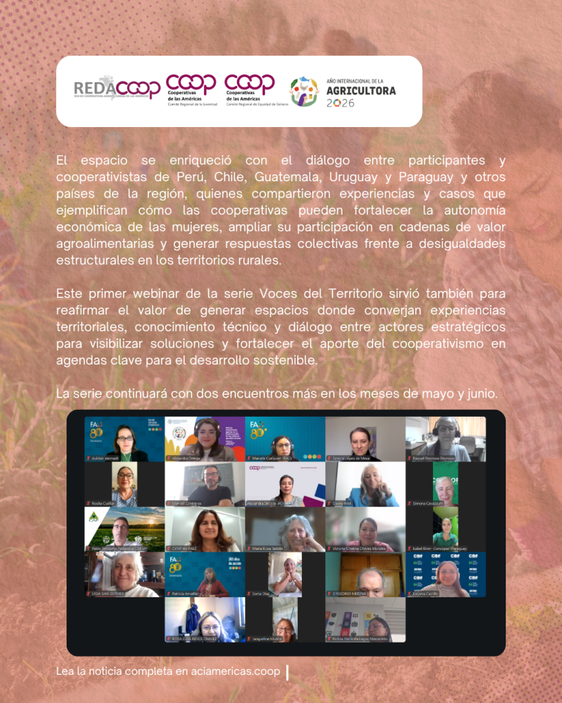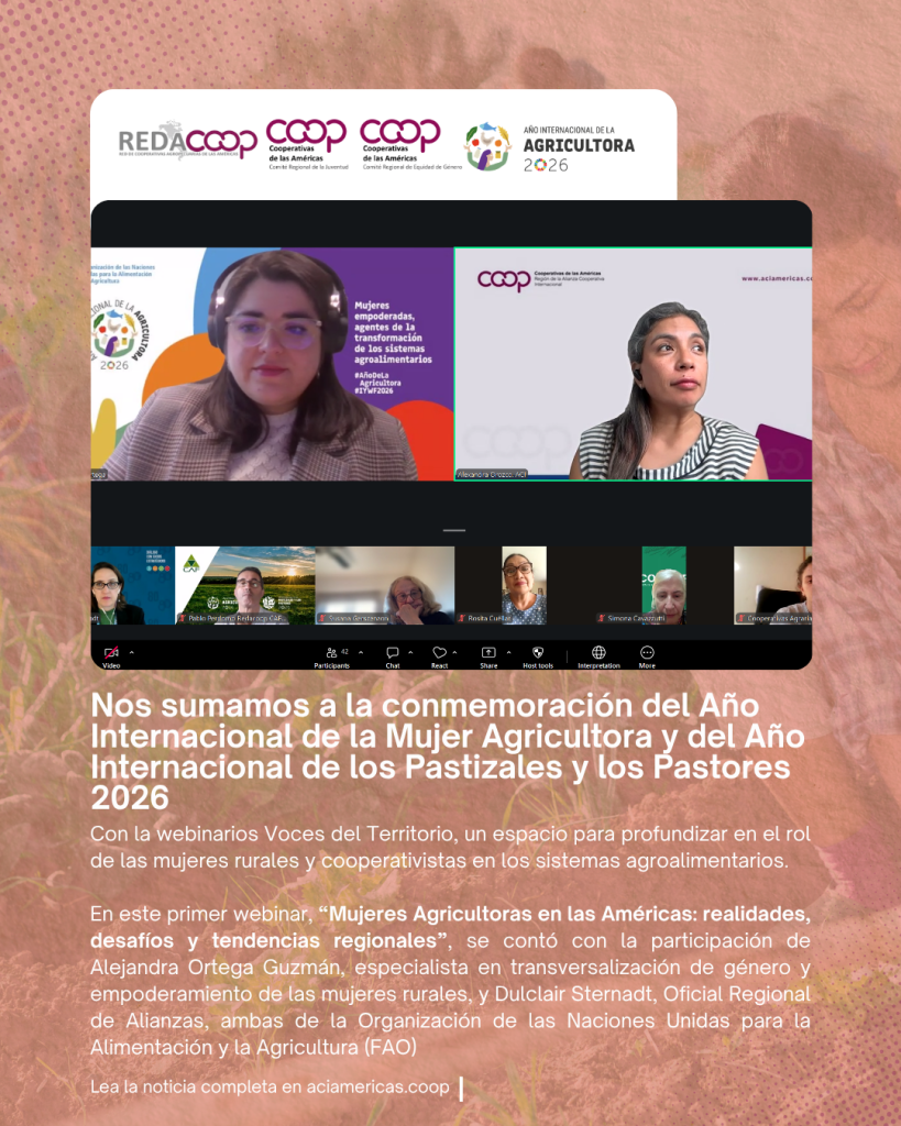 Cooperativas de las Américas se suma a la conmemoración del Año Internacional de la Mujer Agricultora y del Año Internacional de los Pastizales y los Pastores 2026 con la serie de webinarios Voces del Territorio, un espacio de diálogo orientado a profundizar en el rol de las mujeres rurales y cooperativistas en los sistemas agroalimentarios.